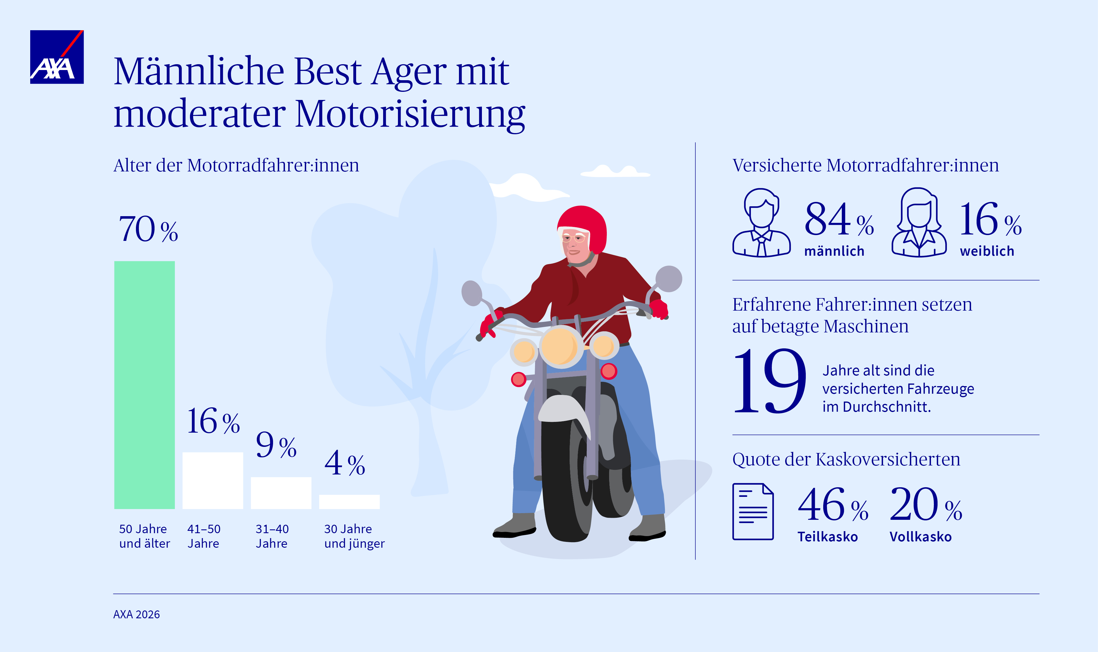 Nach einer Auswertung des Motorradbestands von AXA sind 70 Prozent der versicherten Fahrerinnen und Fahrer 50 Jahre oder älter. Fahrer unter 30 Jahren machen dagegen lediglich rund vier Prozent aus. Insgesamt ist die Szene weiterhin deutlich männlich geprägt: 84 Prozent der Versicherten sind Männer, 16 Prozent Frauen.